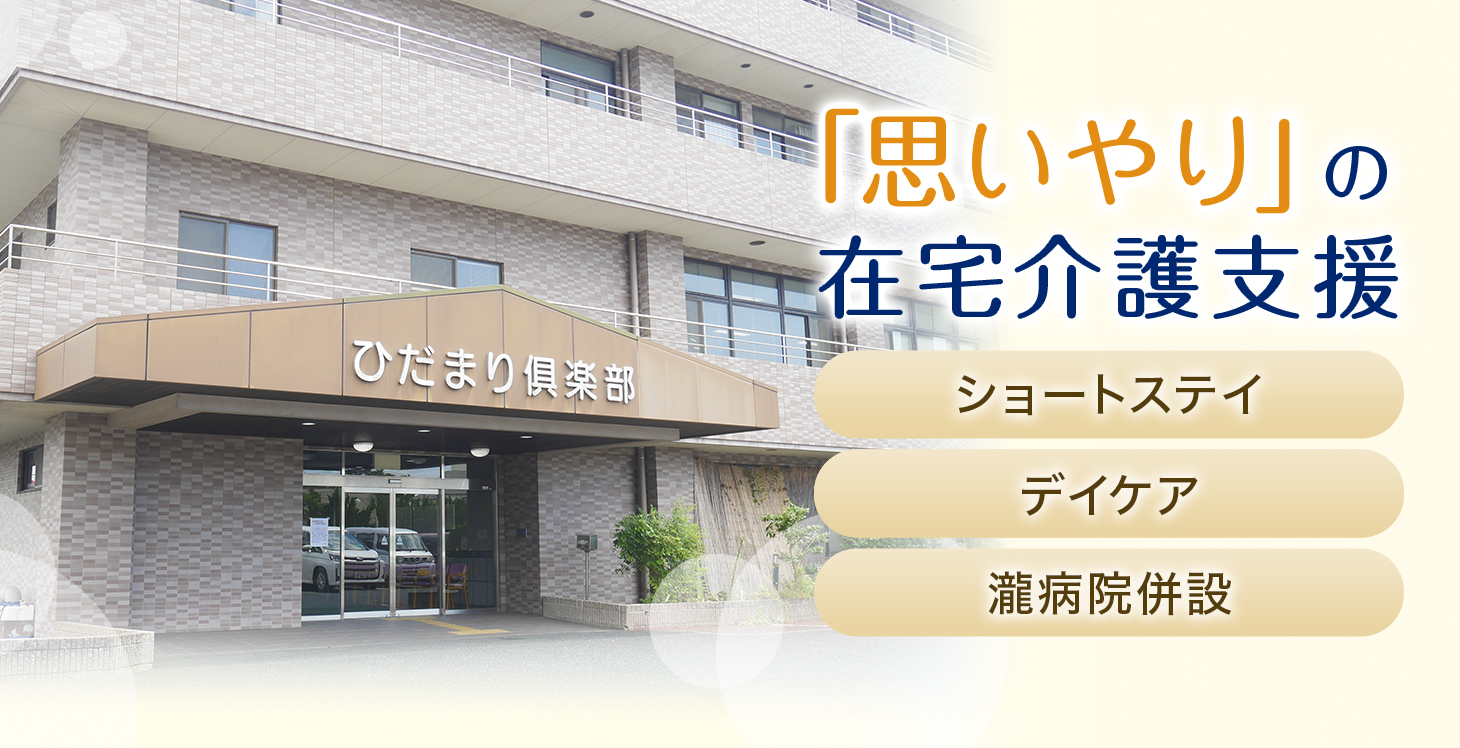 介護老人保健施設『ひだまり倶楽部』は、介護が必要な方々に、医学的管理下での看護、介護、リハビリテーションなどを通して家庭復帰を応援するとともに、ショートステイ(短期入所療養介護)・デイケア(通所リハビリテーション)による在宅介護支援を続けていきたいと考えております。